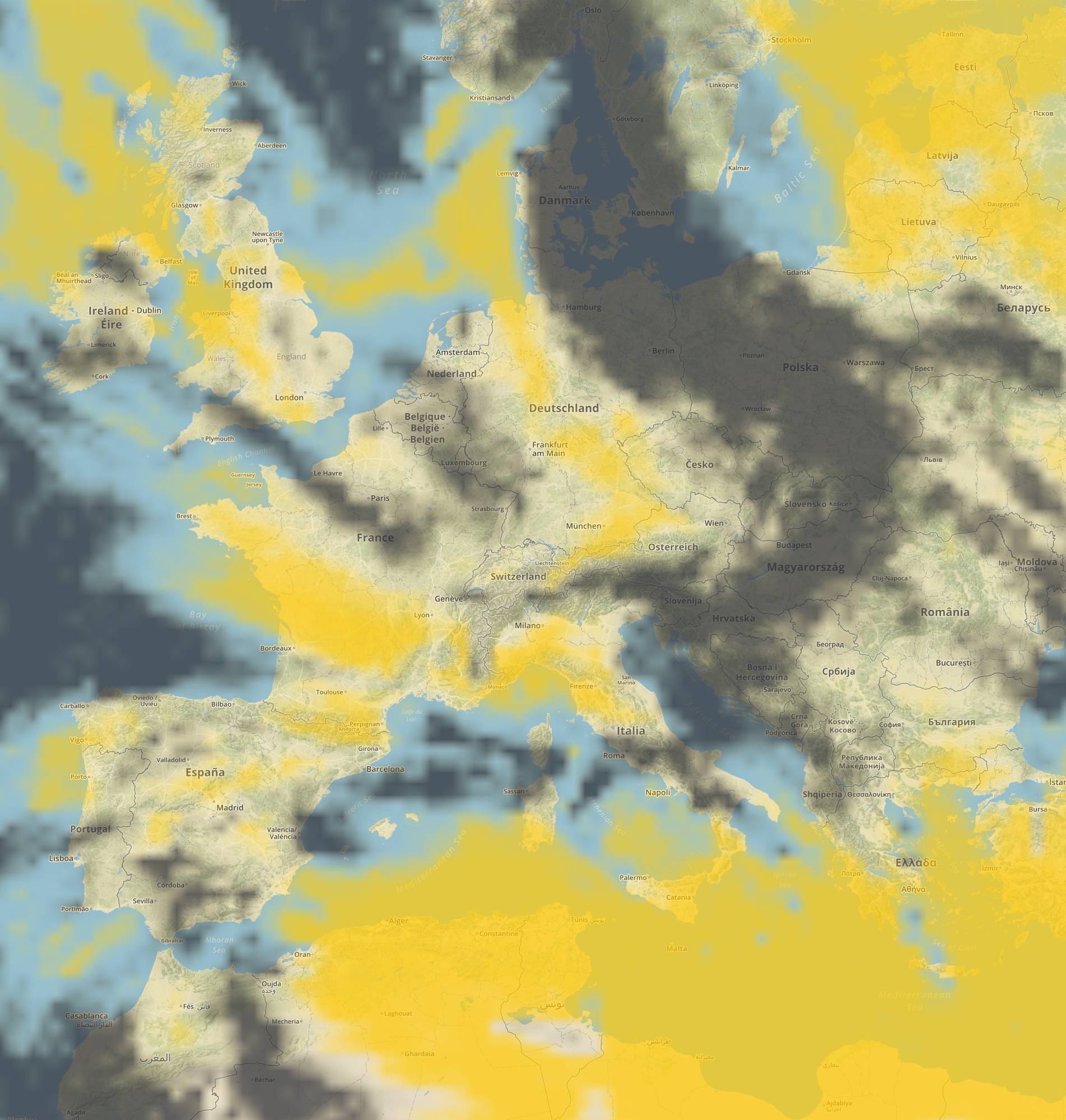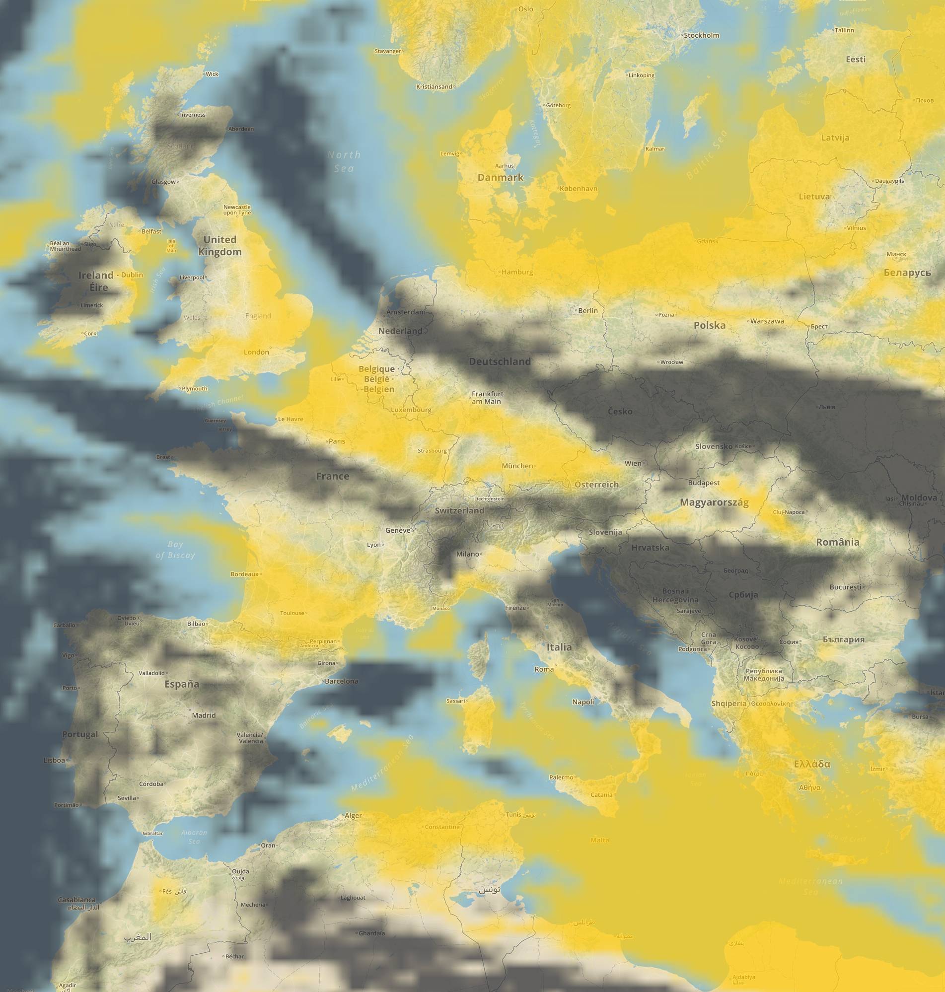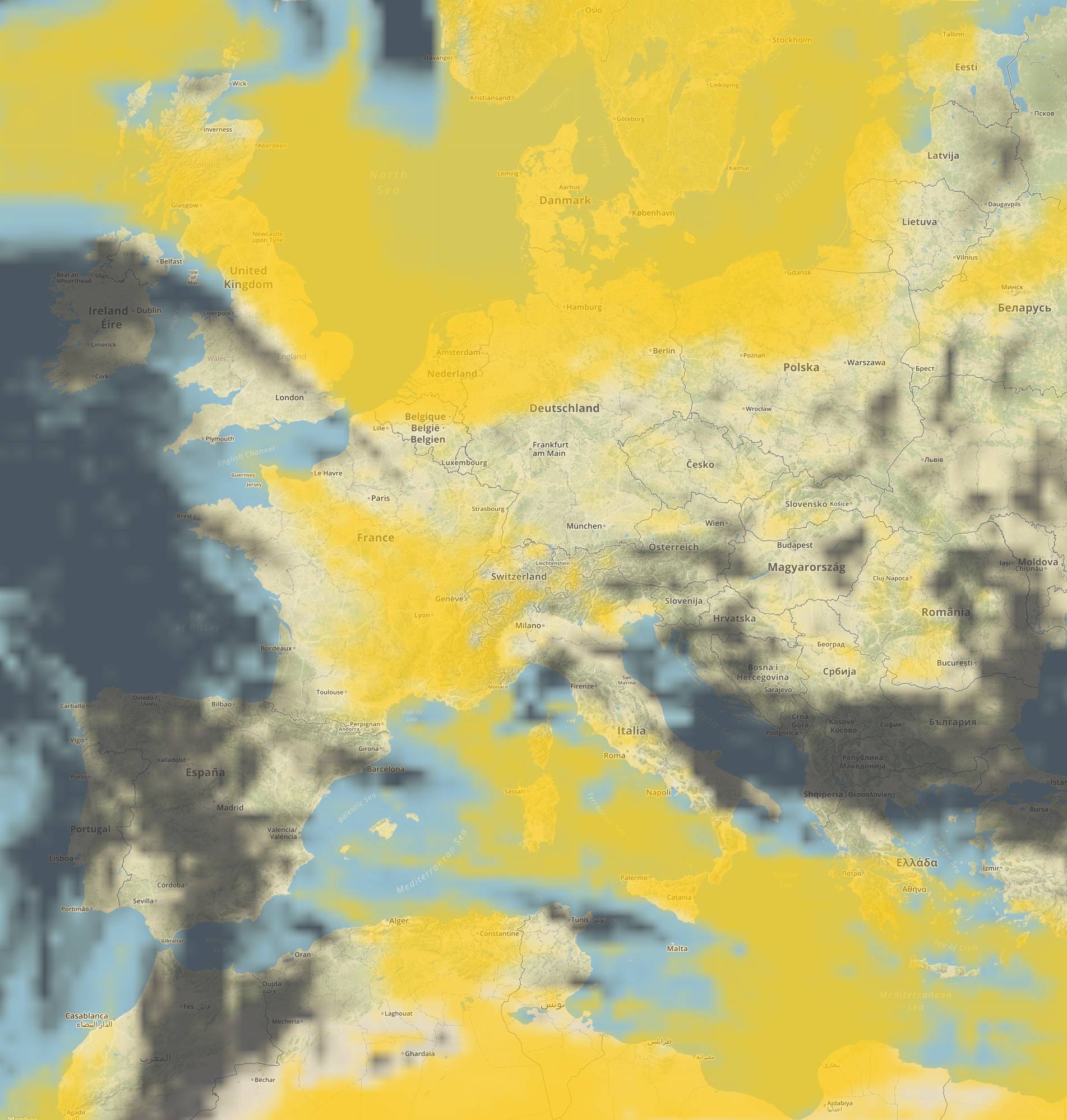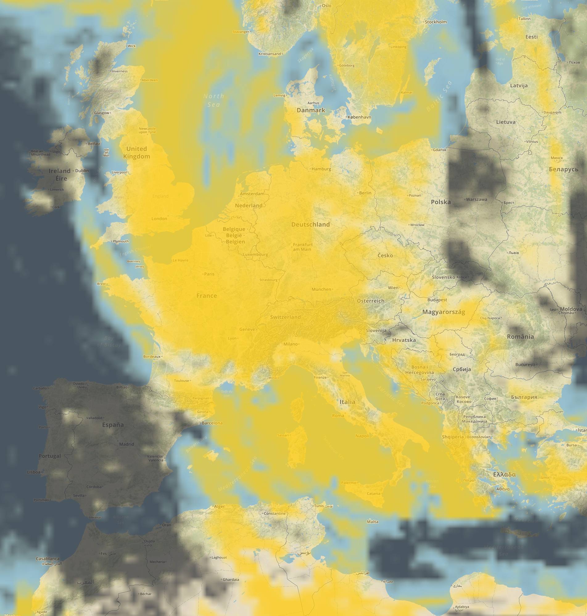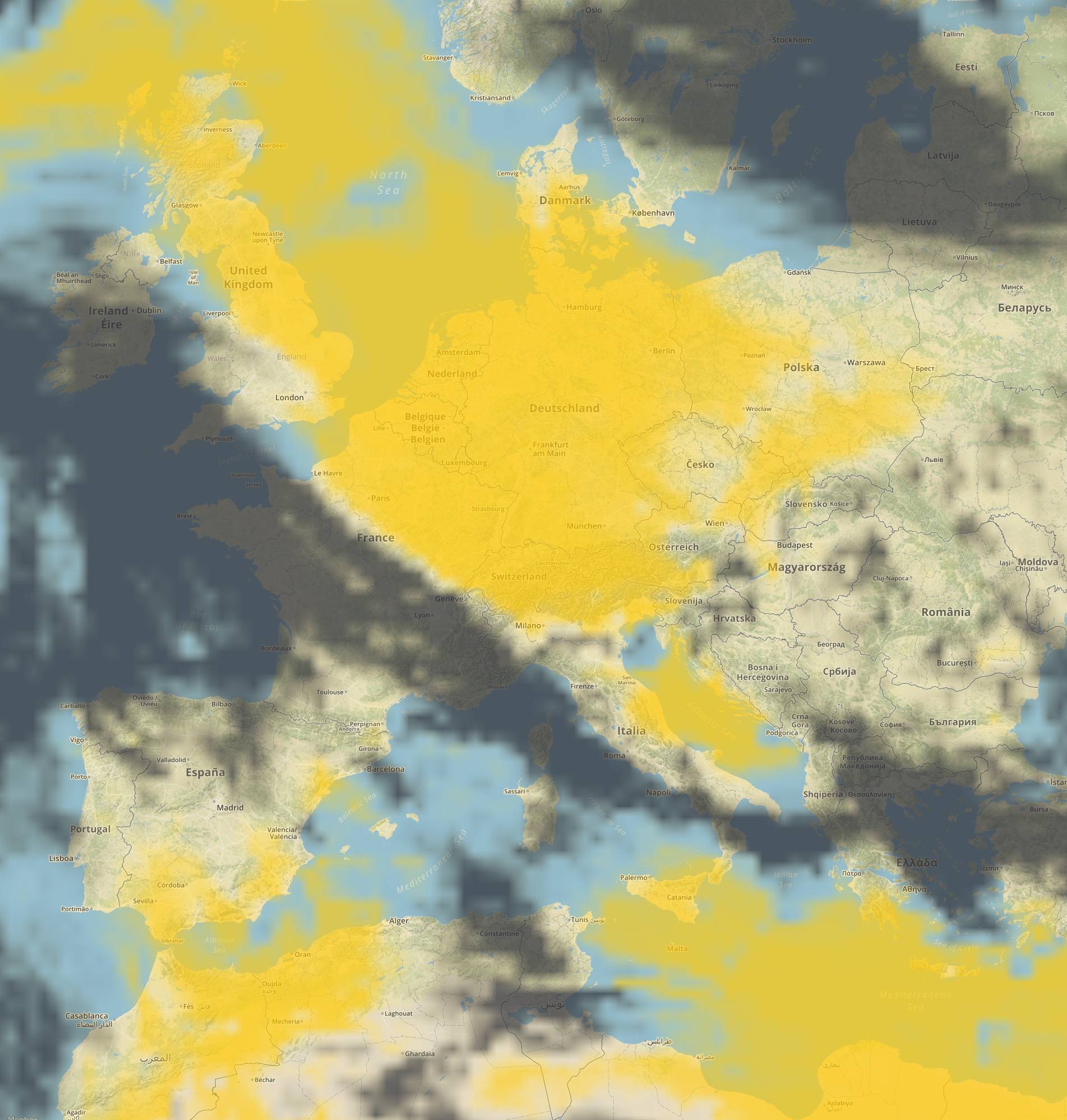 Par défaut les critères de recherche correspondent à un ciel dégagé (d'où la couleur jaune rappelant le soleil). Mais on peut aussi avoir d'autres couleurs il suffit de se référer à la légende en haut à droite de chaque carte qui dépend du calque choisi (couverture nuageuse, températures, précipitations et force du vent).